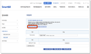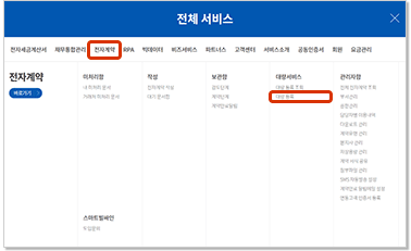 전체서비스 > 전자계약 >대량서비스> 대량등록 메뉴를 클릭합니다. |