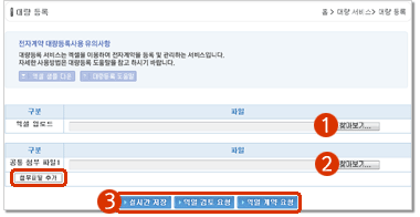 공통 첨부파일 찾아보기 버튼을 클릭하여 각각의 전자계약에 공통되는 첨부파일을 첨부합니다. |