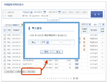 거래업체 미처리문서와 같은 리스트 메뉴에서도 팩스를 사용할 수 있습니다. 해당 문서를 선택하고 팩스발송버튼을 클릭하면 옆 그림과 같이 팩스번호입력 팝업이 나타나 팩스를 발송할 수 있습니다. |
