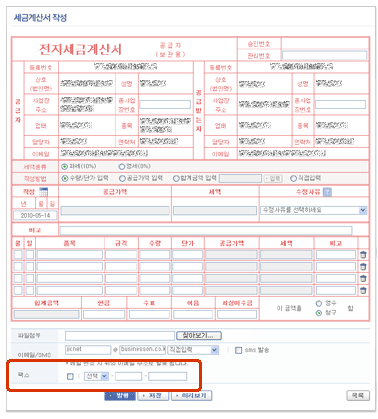 세금계산서 발행 시 문서 아래부분에 여러옵션기능 중 팩스부분을 선택하고 번호를 확인 후 발행 버튼을 클릭하시면 발행과 동시에 팩스가 발송됩니다.