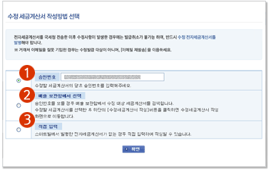 수정할 세금계산서의 승인번호를 알 경우 당초 승인번호를 입력 후 확인 버튼을 클릭하면 3. 수정사유 선택 화면으로 이동합니다. |