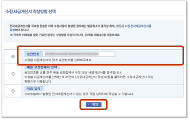 ※ 승인번호 입력 / 매출보관함에서 선택의 방법으로 수정세금계산서를 작성할 경우 당초승인번호가 자동으로 입력됩니다. |