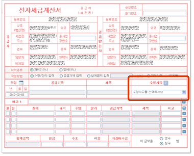| ※ 수정 사유별로 작성일자와 공급가액 자동입력 기능을 제공합니다. (정정사항 입력 항목 제외) |