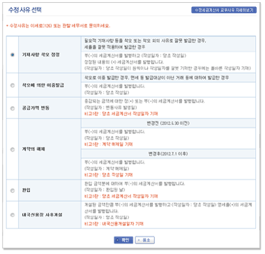 수정사유를 선택 후 확인 버튼을 누르면 수정 사유에 따른 작성 화면을 제공합니다. |