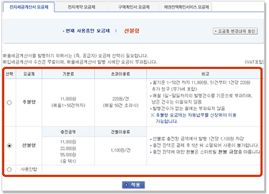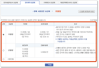 원하시는 요금제를 선택 후 적용버튼을 클릭 하시면 요금제가 선택됩니다.