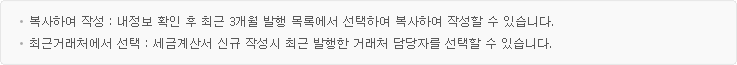 합계금액 입력 후 수량/단가 입력을 선택하거나 수량/단가 입력 후 합계금액 입력을 선택하면 세금계산서 정보가 지워집니다. |