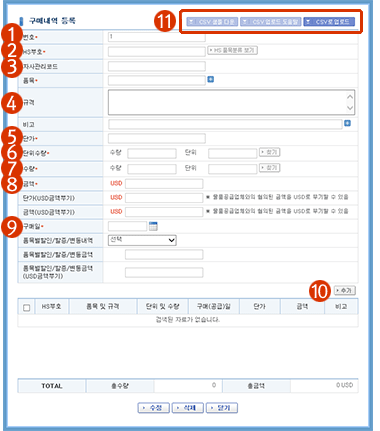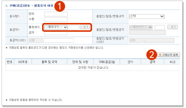 구매내역 등록버튼을 클릭하면 구매내역을 등록할 수 있습니다. 이때 통화코드를 먼저 선택해 주십시오.